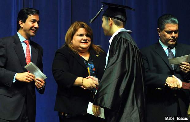 La presidenta de la Cámara de Representantes, Jenniffer González Colón, compartió con alumnos de su alma mater, la Escuela Superior University Gardens, durante los actos de graduación. Allí anunció que estaría otorgándole a cada uno de los graduandos empleo de verano en El Capitolio como recompensa a su excelencia académica.