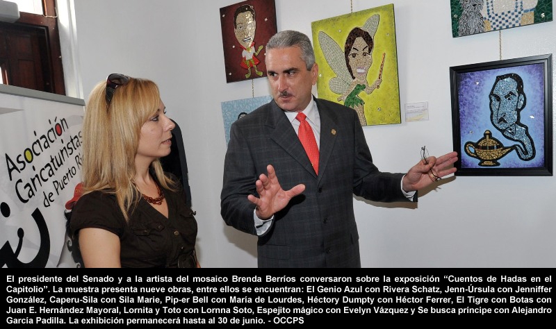“Cuentos de Hadas” consiste en una serie de nueve excelentes caricaturas que tienen la particularidad de haber sido realizadas en mosaico por la artista Brenda Berríos, quien estuvo presente. Las caricaturas aluden a Rivera Schatz; a la presidenta de la Cámara de Representantes Jenniffer González; la senadora Sila Mari González; la senadora Evelyn Vázquez; el senador Juan Eugenio Hernández Mayoral; la ex senadora María de Lourdes Santiago; el senador Alejandro García Padilla; el ex representante Héctor Ferrer y la senadora Lornna Soto Villanueva.