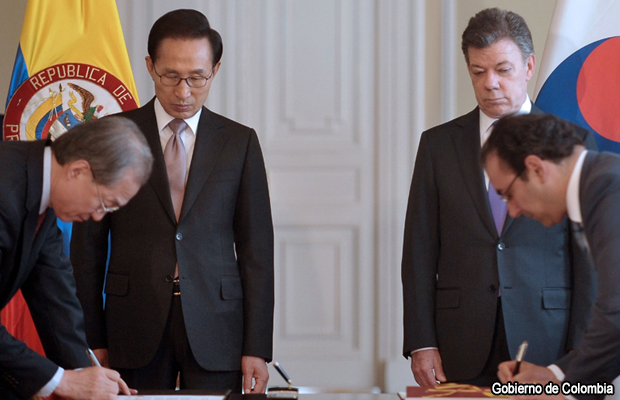 Los presidentes de Colombia, Juan Manuel Santos, y de Corea del Sur, Lee Myung-bak, firmaron este lunes una declaración conjunta que establece las disposiciones para la puesta en marcha del Tratado de Libre Comercio (TLC) entre los dos países. El documento fue suscrito por los ministros de comercio, el colombiano Sergio Díaz-Granados y Taeho Bark de Corea del Sur.