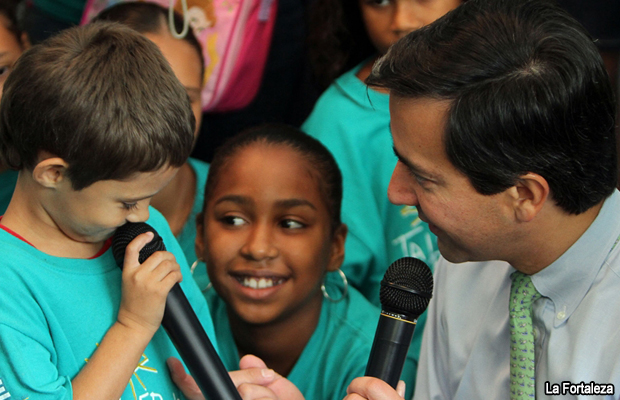 “Ustedes, que están aprendiendo sobre el poder de las comunicaciones, el poder de compartir su mensaje, su opinión, su voz con el mundo a su alrededor, pueden ahora entender mejor mi interés en expandir la educación bilingüe para que todos ustedes puedan dominar tanto el español, como el inglés. Igual que las cámaras y las computadoras se han convertido en una destreza necesaria en este mundo cada vez más tecnológico, el inglés es esencial para poder triunfar en el mundo que les espera afuera del salón de clases. Mientras más preparados con más herramientas puedan salir allá afuera, mejor”, finalizó el Gobernador.