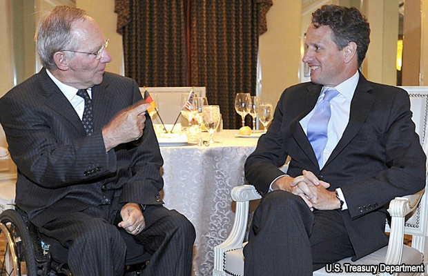 Geithner y Schaeuble suscribieron un comunicado tras reunirse en una isla alemana en el Mar del Norte donde reafirmaron que sus respectivos gobiernos cooperarán estrechamente para estabilizar las economías europeas.