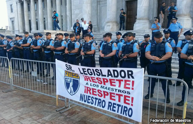 Los agentes trasladados desde Moca, así como de otros pueblos pertenecientes al a región policial de Aguadilla, son parte del contingente de uniformados desplegados desde ayer en la mañana en el área de El Capitolio ante la discusión del proyecto que reforma el Sistema de Retiro para Maestros (SRM).