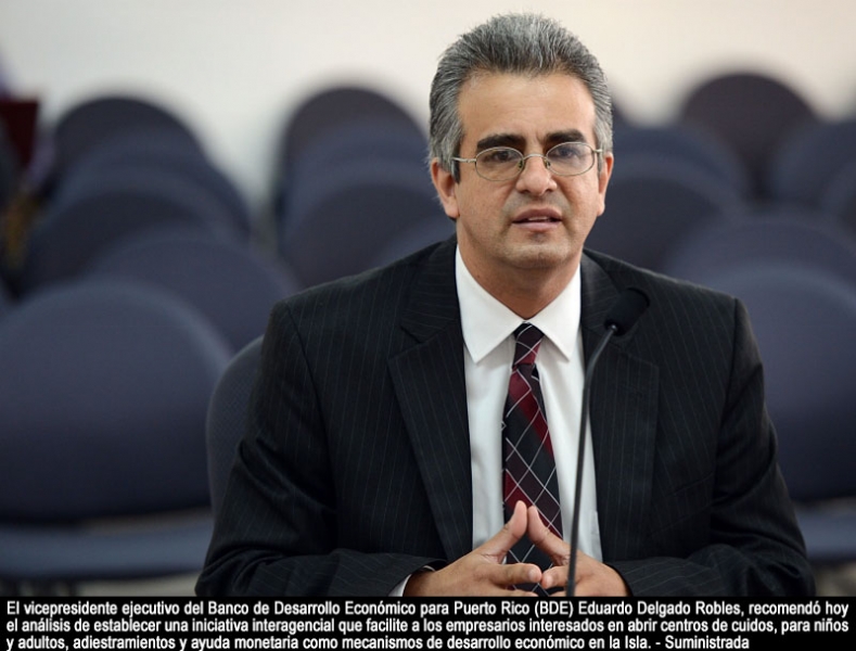 El vicepresidente ejecutivo del Banco de Desarrollo Económico para Puerto Rico (BDE) Eduardo Delgado Robles, recomendó hoy el análisis de establecer una iniciativa interagencial que facilite a los empresarios interesados en abrir centros de cuidos, para niños y adultos, adiestramientos y ayuda monetaria como mecanismos de desarrollo económico en la Isla. Vea las fotos