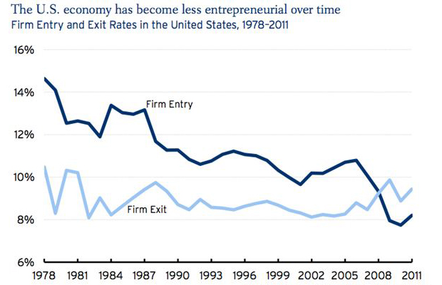Un estudio de este centro de investigaciones analizó la creación y desaparición de negocios entre 1978 y 2011, período en el que el surgimiento de nuevas empresas declinó en alrededor de la mitad.