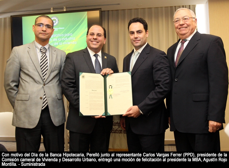 Con motivo del Día de la Banca Hipotecaria, Perelló Borrás junto al representante Carlos Vargas Ferrer (PPD), presidente de la Comisión cameral de Vivienda y Desarrollo Urbano, entregó una moción de felicitación al presidente la MBA, Agustín Rojo Montilla.
