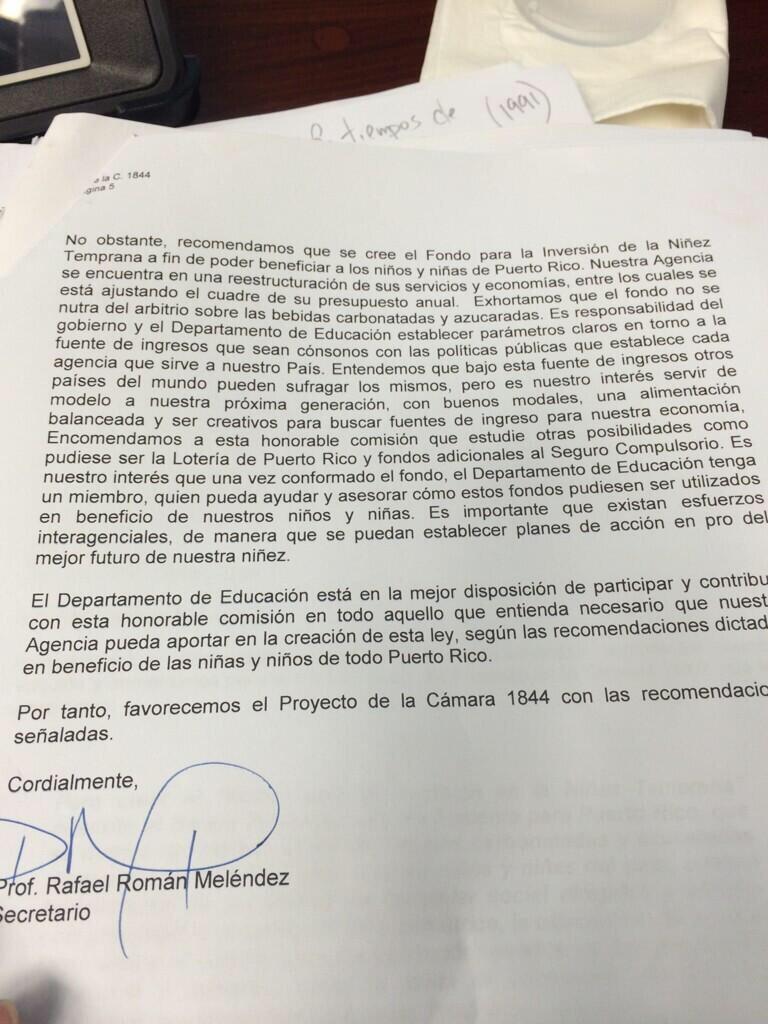 “Exhortamos que el fondo no se nutra del arbitrio sobre las bebidas carbonatadas y azucaradas. Es responsabilidad del gobierno y el Departamento de Educación establecer parámetros claros en torno a la fuente de ingresos sean cónsonos con las políticas públicas que establece cada agencia que sirve a nuestro País. Entendemos que bajo esta fuente de ingresos otros países del mundo pueden sufragar los mismos, pero es nuestro interés servir de modelo a nuestra próxima generación, con buenos modales, una alimentación balanceada y ser creativos para buscar fuentes de ingreso para nuestra economía.