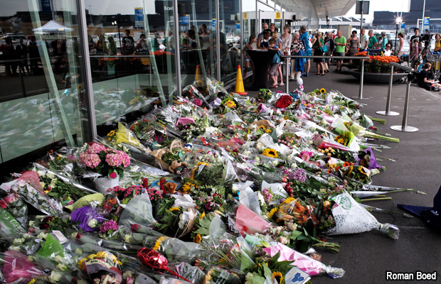 Decenas de personas han dejado arreglos florales en el Aeropuerto de Amsterdam en honor a los pasajeros del vuelo MH17 de Malaysian Airlines.