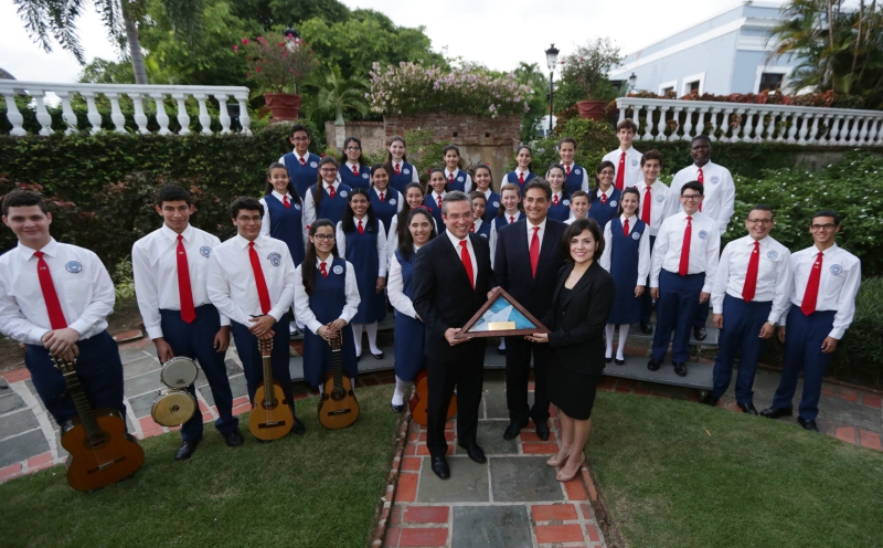El gobernador agradeció y felicitó a los miembros del Coro y a su directora, María Gabriela Fernández, por la excelente representación del talento puertorriqueño en las diferentes presentaciones que tuvieron en Europa; y entregó a la directora del Coro una bandera de Puerto Rico para conmemorar la hazaña.