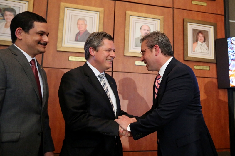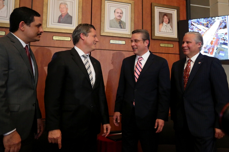 El gobernador, Alejandro García Padilla (derecha) saluda al presidente de Lufthansa Puerto Rico, Elmar Lutter; en compañía del presidente de la Universidad de Puerto Rico (UPR), Uroyoán Walker Ramos.