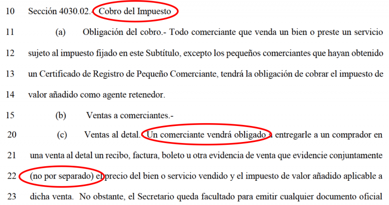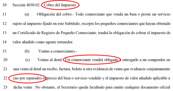 Explicó que la Sección 4030.02, Cobro del Impuesto, en el inciso (c), indica: Ventas al detal.-Un comerciante vendrá obligado a entregarle a un comprador en una venta al detal un recibo, factura, boleto u otra evidencia de venta que evidencie conjuntamente (no por separado) el precio del bien o servicio vendido y el impuesto de valor añadido aplicable a dicha venta.