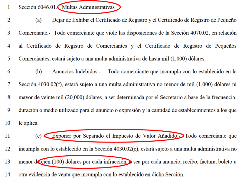 Mientras, la Sección 6046.01, Multas Administrativas, también en el inciso (c), indica: Exponer por Separado el Impuesto de Valor Añadido.- Todo comerciante que incumpla con lo establecido en la Sección 4030.02(c), estará sujeto a una multa administrativa no menor de cien (100) dólares por cada infracción, o sea por cada anuncio, recibo, factura, boleto u otra evidencia de venta que incumpla con lo establecido en dicha Sección.