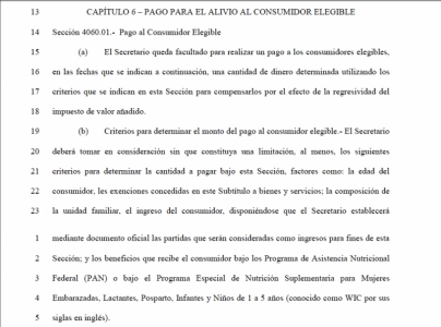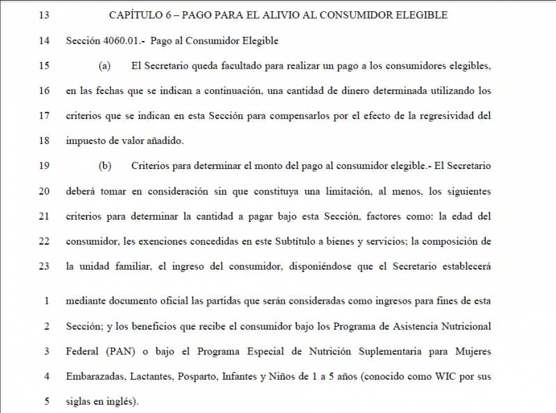 Según la Sección 4060.01 del Capitulo 6 – PAGO PARA EL ALIVIO AL CONSUMIDOR ELEGIBLE (p.1096), se establece que el Secretario de Hacienda queda facultado para realizar un pago a los consumidores elegibles,… una cantidad de dinero determinada utilizando los criterios que se indican en esta sección, para compensarlos por el efecto de la regresividad del IVA. En el siguiente inciso (b) los criterios establecidos son: edad del consumidor, las exenciones concedidas a bienes y servicios, la composición de la unidad familiar, el ingreso del consumidor, beneficios que recibe del Programa de Asistencia Nutricional o del Programa Especial de Nutrición Suplementaria para Mujeres Embarazadas, Lactantes, Posparto, Infantes y Niños, mejor conocido como WIC.