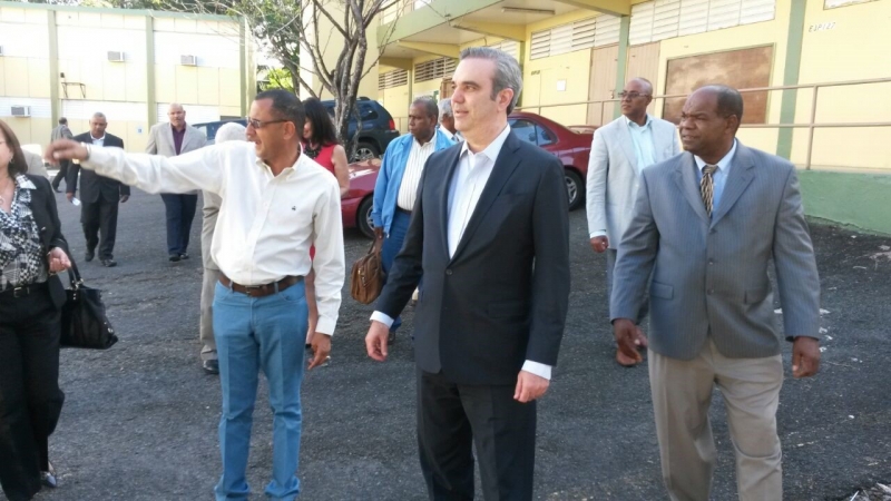 El vicepresidente del PNP, Abel Nazario (izquierda) junto al candidato a presidente de la República Dominicana, Luis Abinader, durante su visita a la escuela Facundo Bueso en Santurce.