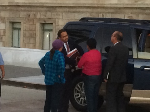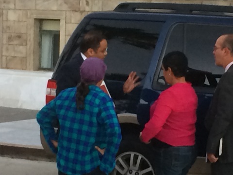 La portavoz de EDUCAMOS, Eva Ayala (con blusa roja) confronta al secretario de Educación, Rafael Román frente al Capitolio.