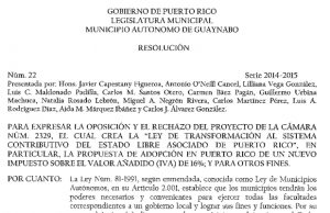 Legislatura Municipal de Guaynabo aprueba resolución en rechazo a la imposición del IVA y en rechazo del gasto de fondos públicos para promover el nuevo...